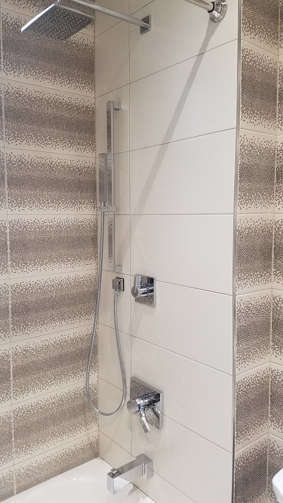 The two tiles have the same shape. Their colors and shades complement each other amazingly well. By combining two types of bathroom tile in one space we got a beautifully balanced and calming spa-like bathroom.