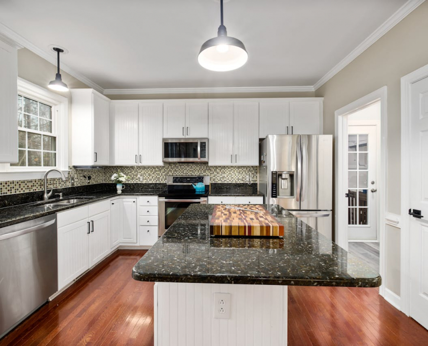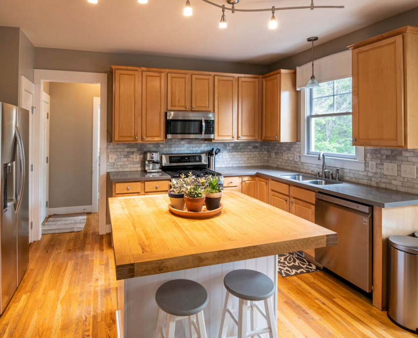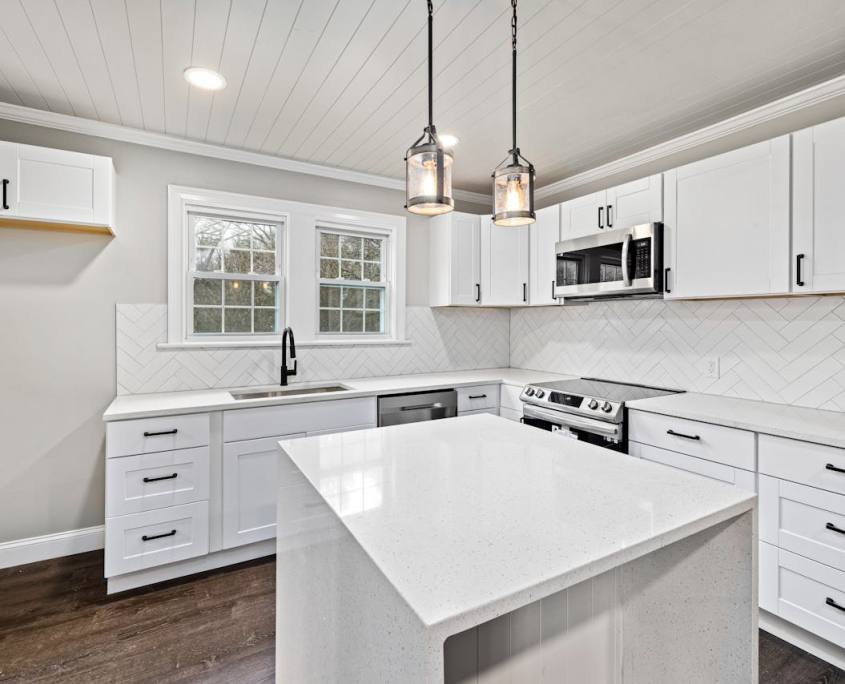 After: Kitchen and bath remodel project in NY, with its bold redesign and focus on modern open kitchen design, transformed the entire home, making it more livable and aesthetically pleasing.