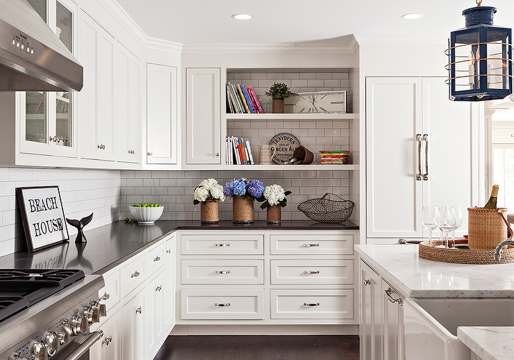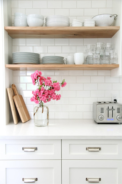 White Shaker Cabinetry with Copper/Rose Gold Hardware, White Subway Tile Backsplash, and Open Shelving at Homespo