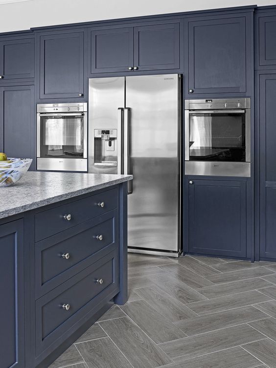 Navy Blue is darker and not so versatile and flexible like grey or white. Still, it works successfully with any kitchen cabinet style or decor. As opposed to a year or two ago, when Navy Blue cabinet door style wasn’t a common choice in kitchen design, in 2025 they will be popular and seen as a classy kitchen cabinet design choice.