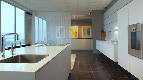 The cabinet around your sink can carry designs that beautify your kitchen. You may create a window around your kitchen sink, and the design may focus on the window that sits just over the sink. Consider how you will design the door to match the rest of the room, and remember that you can use the cabinet door by your sink to begin a style revolution in your kitchen. A tin of paint or stain will help enhance the door immediately.