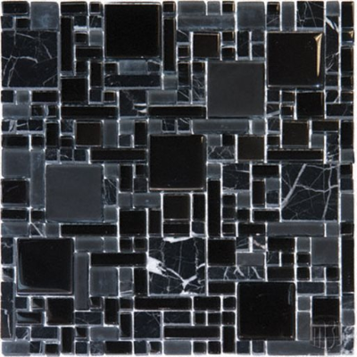 Black Marble and Glass Mixed Patter tiles are an elegant and dramatic mix of deep charcoal glass and black marble tiles. Recommended uses include walls, backsplashes and other design features.