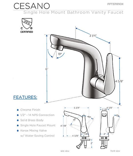 This single hole faucet is made from heavy duty brass with a chrome finish. Features a Hydroplast mixing valve with water saving control.