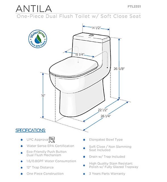 The Antila elongated, one-piece toilet features an elegant, sophisticated design, that is both comfortable look at and to sit on. This toilet features a dual flushing system with option of a 0.8gpf or 1.6gpf. This great feature makes it really easy to conserve water. It also features a fully glazed inner trapway and comes with a stain resistant polish making it easy to keep clean.