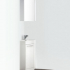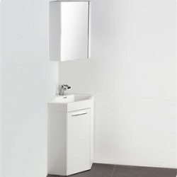 The Coda is a corner vanity and perfect as a space saver. It features an all white appearance that just oozes freshness. It has a bottom cabinet for storage and a great matching sink. This vanity comes with everything you need to install. Many faucet styles to choose from. Optional matching medicine cabinet available.