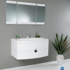 This vanity can fit anywhere. At 36″, this vanity is ideal for adding some brightness or funk to your bathroom with its bright white color. Ingenious basin design is brought together with a large, tri-hinged mirror- a great addition to catch those hard-to-see spots for that perfect shave or see all angles before putting down that mascara for a night out on the town. That mascara and shaver rest in a clever, handsome, and chic storage solution underneath. An ensemble that is sure to be a delight in function and in sleek design that really shines through in its simplicity from hardware to design.