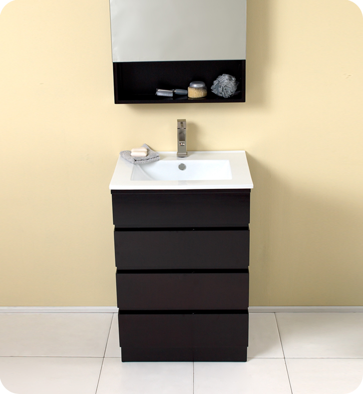 This sweet, simple chic to the point of efficient vanity is complimented by a white sink basin and chrome hardware. Great for small spaces for a small office or the one person studio nestled into the Upper West Side. Features a beautiful espresso finish with medicine cabinet. Many faucet styles to choose from. Optional side cabinets are available.
