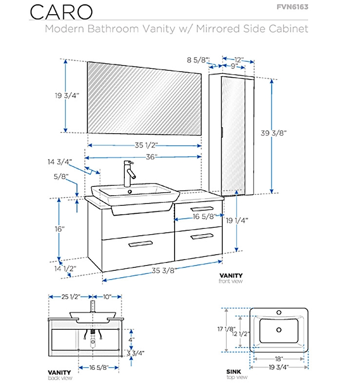 Vanity: W 36″ x D 14.75″ x H 19.25″