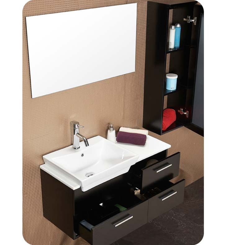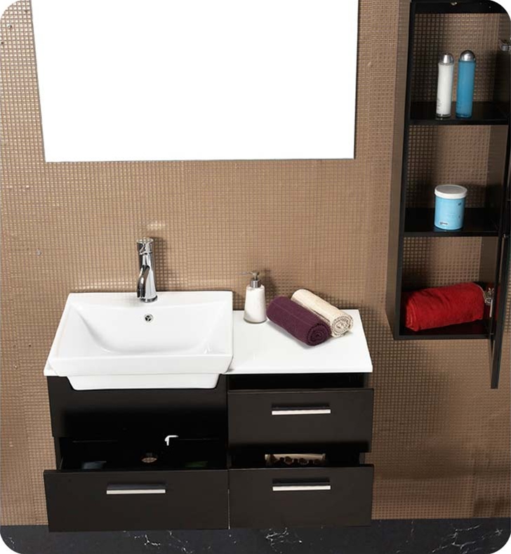 This solid wood espresso ensemble is contemporary and chic in design. This vanity offers a touch of sophistication of white counter top contrasted and a white basin against natural wood. Comes with a mirror and an additional storage cabinet. Ideal for anyone looking for a simple yet elegant look.
