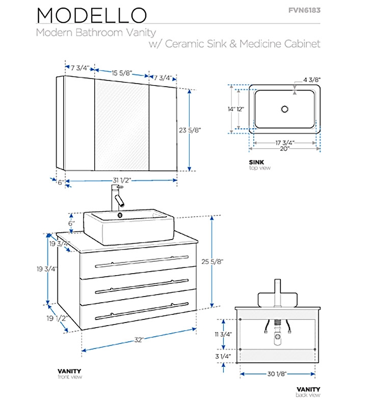 Vanity: 32″W x 19 3/4″D x 25 5/8″H