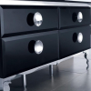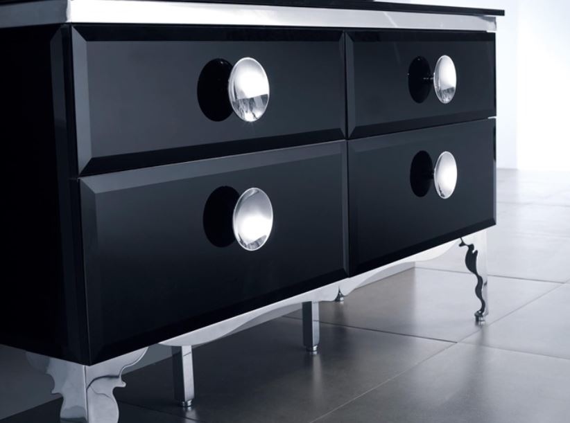 Materials: Steel Frame, Tempered Glass Countertop, Ceramic Sink, Macasser Ebony Veneer Drawers