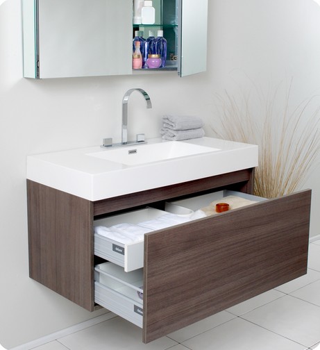 This vanity is striking in its simplicity. It features a beautiful widespread chrome faucet. Don’t forget to check under the hood with the innovative storage system that includes a nested drawer. It also features a medicine cabinet that can be either wall mounted or recessed into a wall. The Mezzo is a larger version of the Nano Vanity. Optional side cabinets are available.
