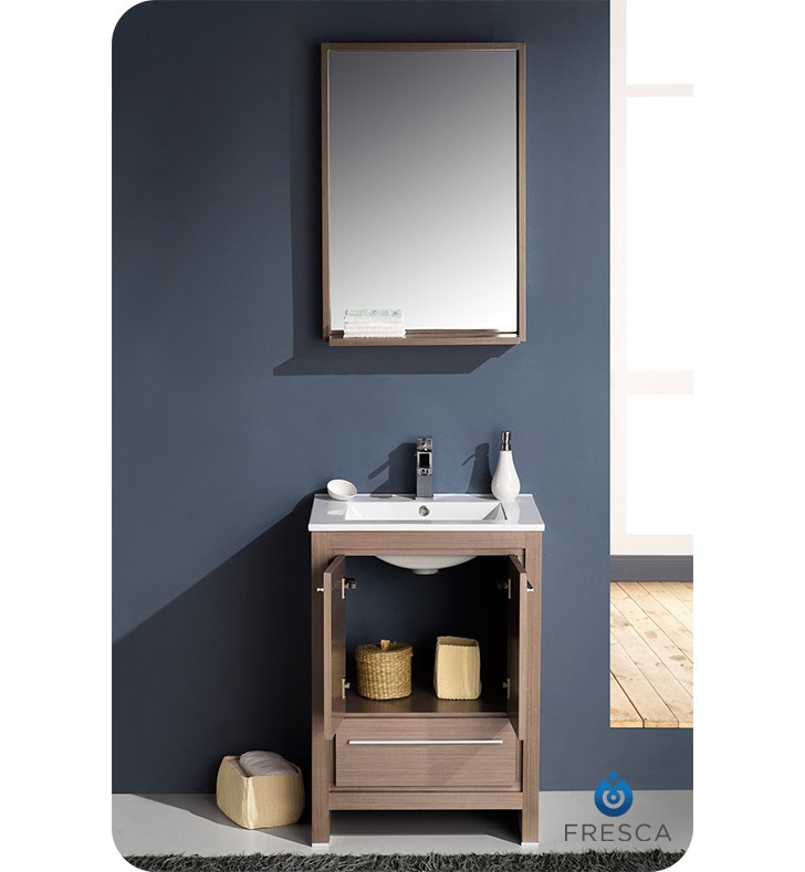 The Fresca 24″ Allier is a compact free standing vanity with plenty of storage space. This model is accented nicely with a matching mirror with small shelf. Optional side cabinets are available. Many faucet styles to choose from.