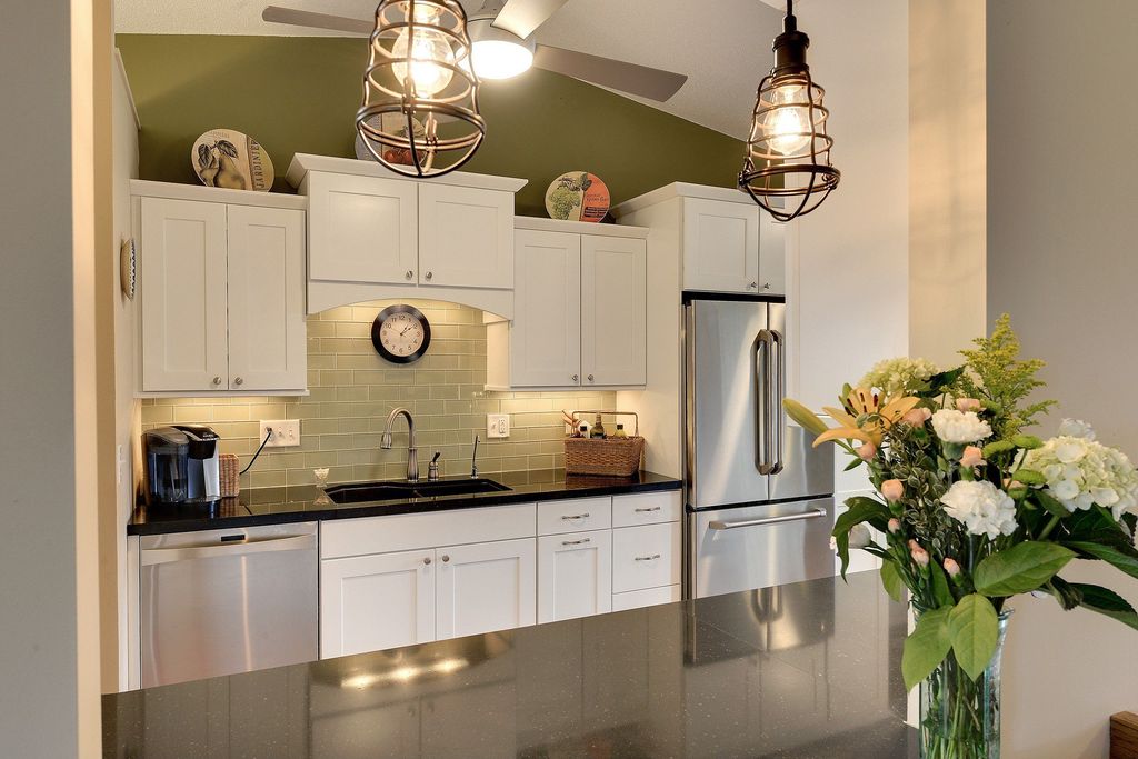 You can decide to combine your shaker white kitchen cabinets with a colorful granite rich with hues and shades to add a specific interest to your kitchen space.